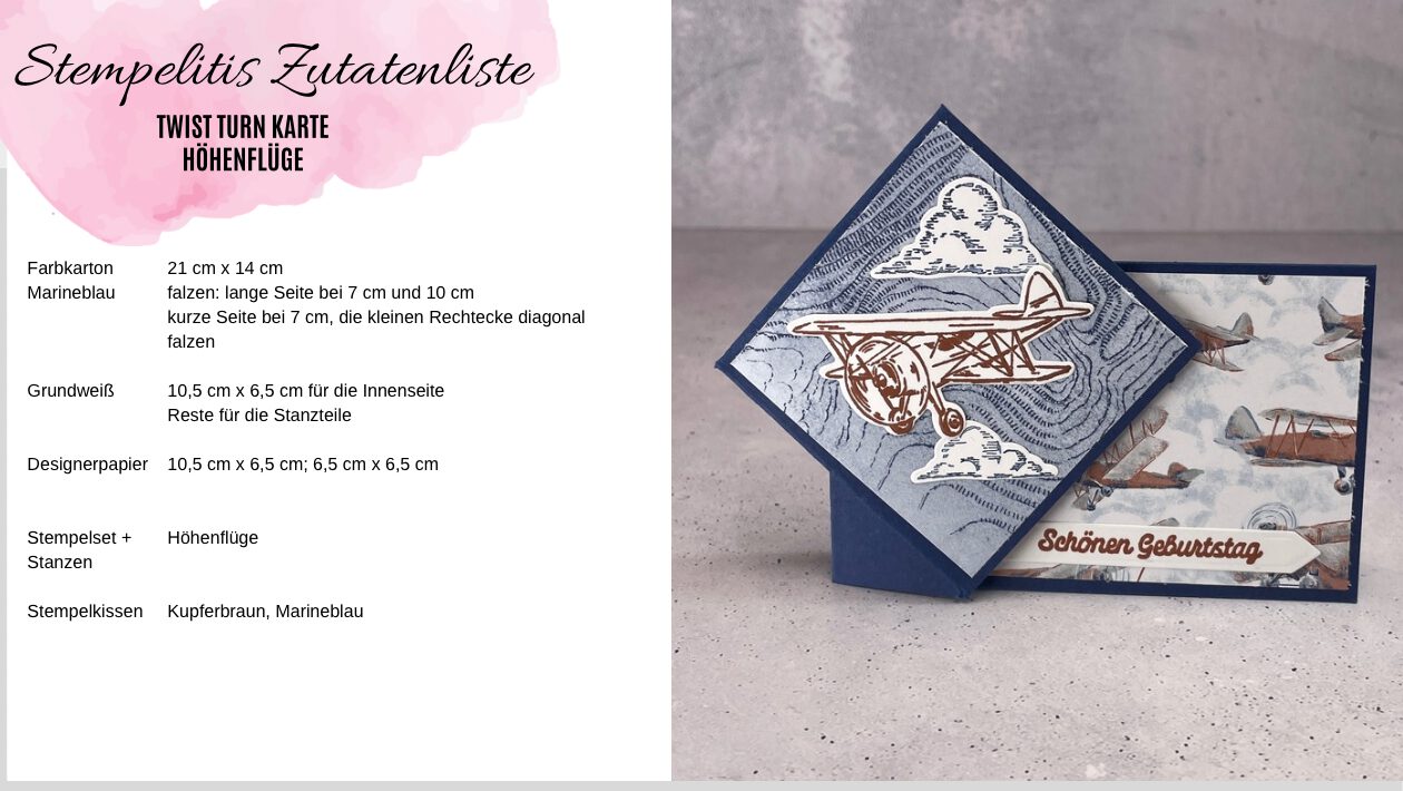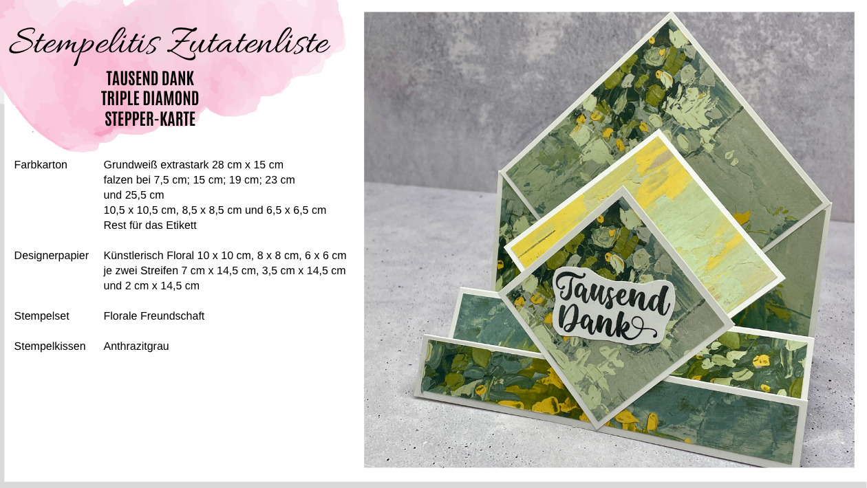 Eine ganz tolle Kartenform mit 3D Effekt. Achtung, kleiner Fehler in der Zutatenliste: Wenn du die Karte auch außen dekorieren willst, brauchst du zwei zusätzliche Stücke Farbkarton in Jade 10 cm x 10 cm und Designerpapier 9,5 cm x 9,5 cm.