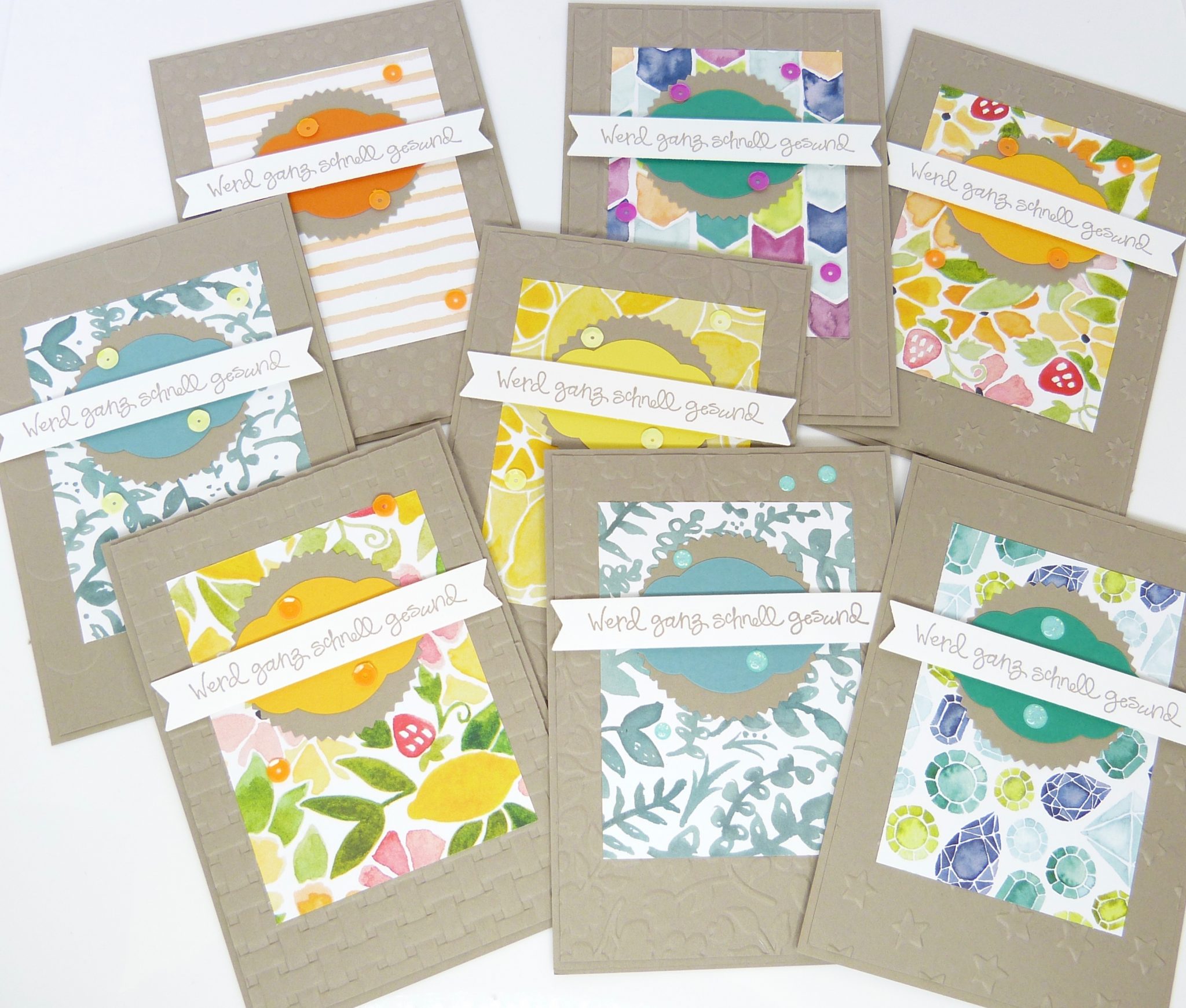 Meine Gesundwerdkarten für Männer habe ich dir vor ein paar Tagen gezeigt. Weil mir das so viel Spaß gemacht hat – und ich auch noch ein paar Reste Designerpapier herumliegen hatte – sind auch gleich noch ein paar Blumige Gesundwerdkarten dazugekommen: