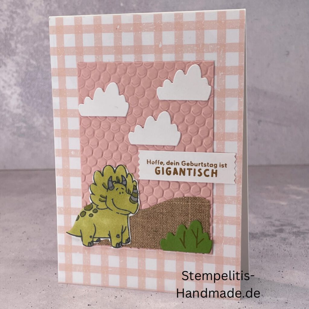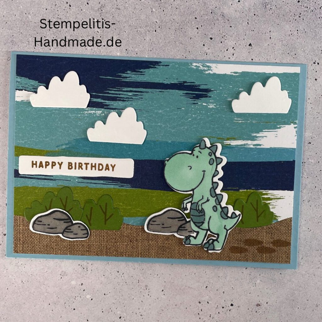 Danach habe ich ein paar weitere Karten mit den Dinos gebastelt. Die Motive sind in Memento schwarz gestempelt und mit Stampin‘ Blends koloriert.