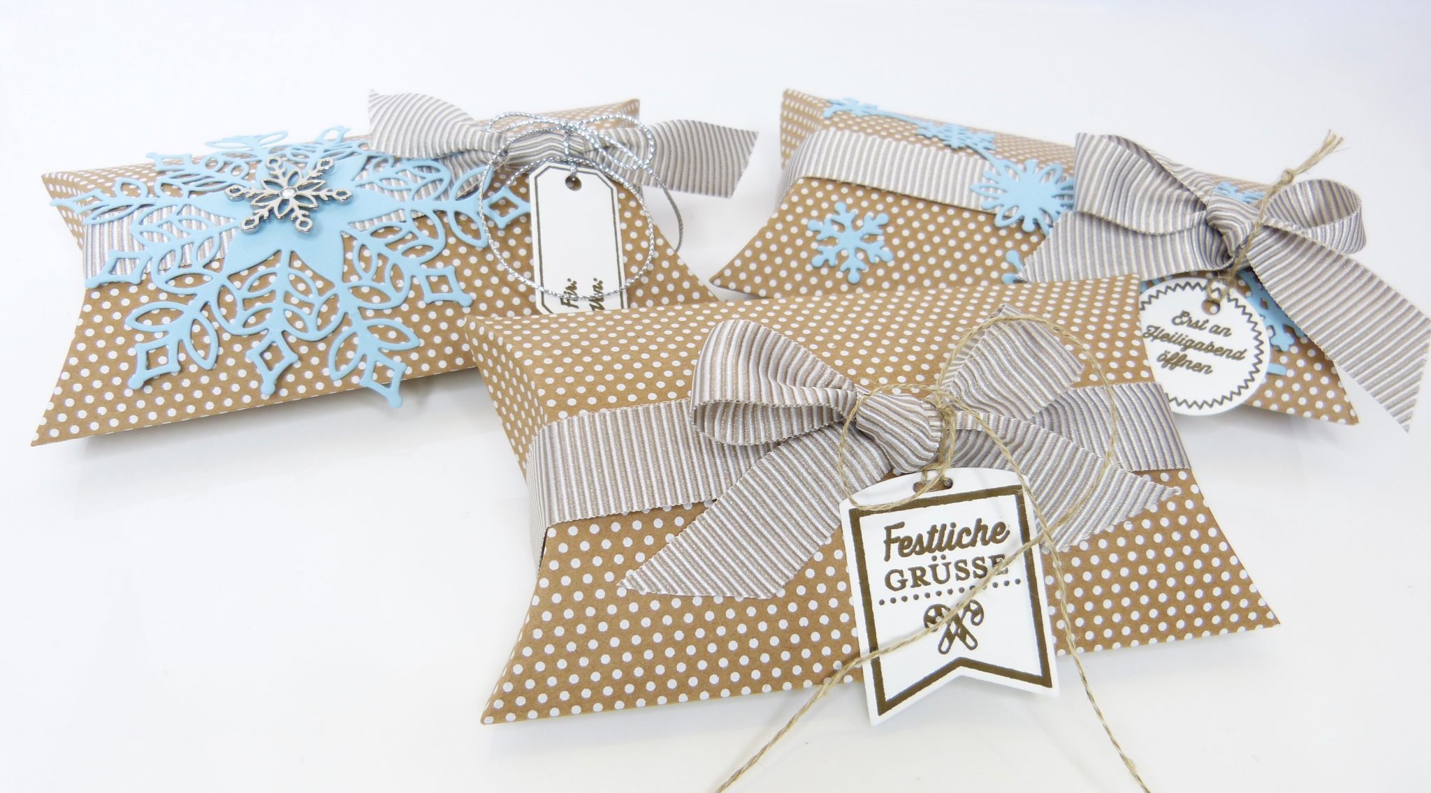 Und auch ganz ohne Schneeflocken, sehen die Pillowboxen mit Schleife und Anhänger gut aus: