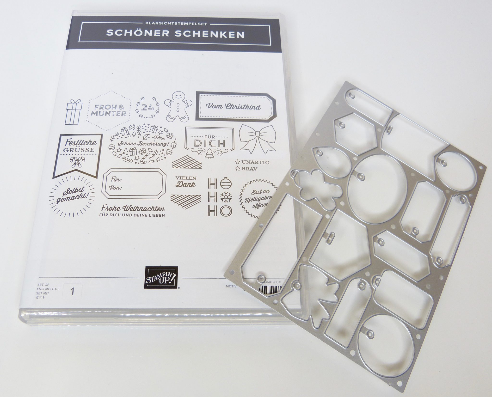 Mit dem großen Schöner schenken Stempel kannst du gleichzeitig 16 verschiedene kleine Geschenkanhänger stempeln. Er ist quasi wie ein Hintergrundstempel. Mit dem passenden Thinlit Weihnachtsanhänger kannst du auch alle Motive gleichzeitig ausstanzen. Diese Möglichkeit hält mich (bisher noch) davon ab, die Stempel auseinander zu schneiden und einzeln zu verwenden…